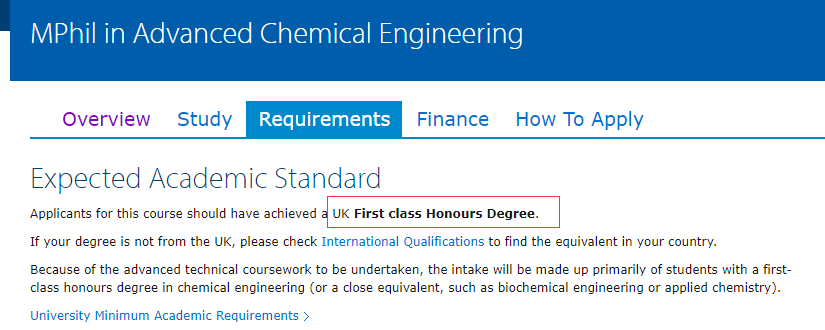 比如剑桥大学的MPhil in Advanced Chemical Engineering专业需要申请人拥有一等学位。