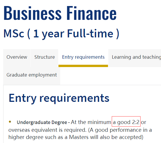 比如伦敦大学玛丽皇后学院的Business Finance专业要求就是二等二学位及以上。