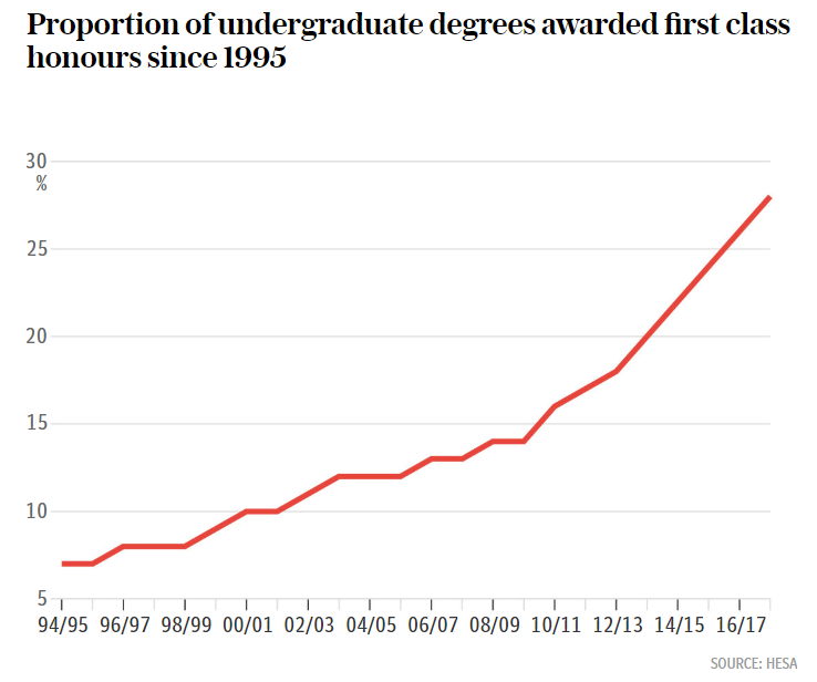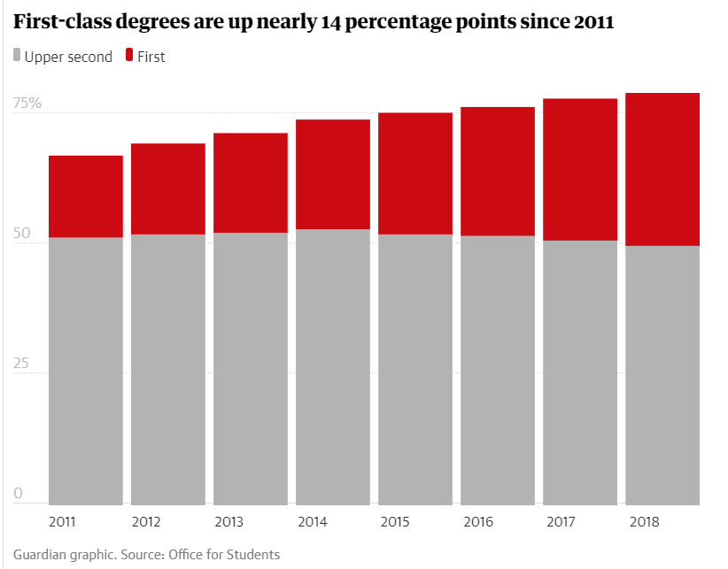 英国学生办公室OfS的数据显示,2018年大概有近半的毕业生都以二等一级成绩毕业。